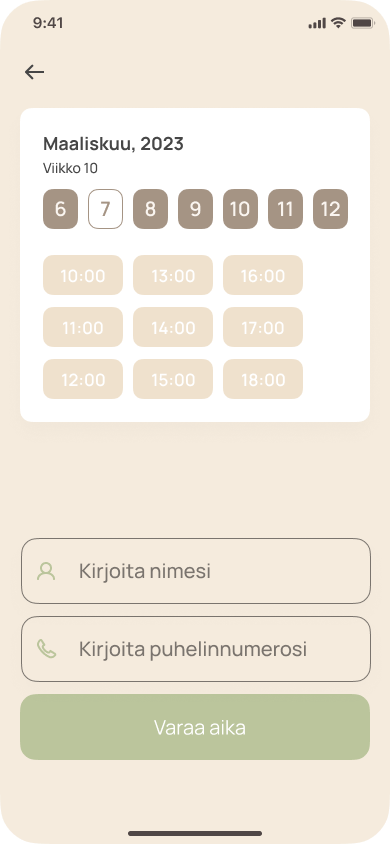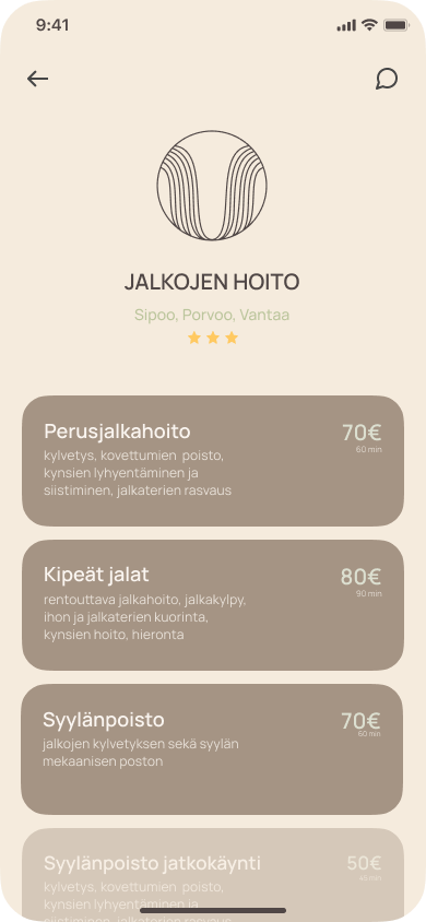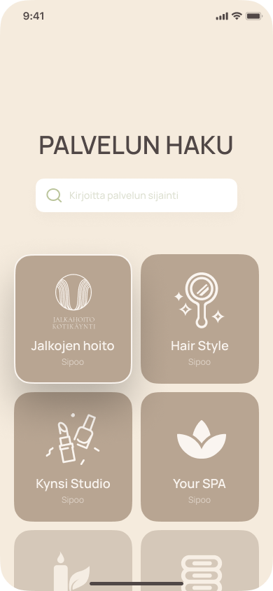 Oletetaan, että vanhainkodissa tarvitsee jalkahoitopalvelua ja henkilöllä ei ole mahdollisuutta käydä salongissa. Ensin asiakas valitsee yhden palvelun palvelukategorioista ja sen jälkeen kirjoittaa hakukenttään oma sijainti ja saa tulokseksi näitä palveluita tarjoavat yritykset lähialueella. Tämän jälkeen asiakas voi valita haluamansa palvelun. Asiakas voi varata palvelulle ajan tai ottaa yhteyttä palveluntarjoajaan. Tässä tapauksessa olen supistaneet kohderyhmämme kauneuspalvelua tarvitseviin.